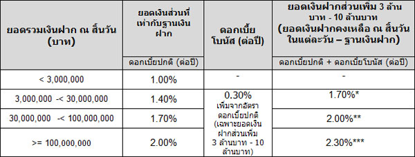 - ลูกค้าจะได้รับดอกเบี้ยโบนัส ในกรณีที่มียอดเงินฝากส่วนเพิ่มในแต่ละวันเทียบกับฐานเงินฝากคงเหลือ ณ สิ้นวันที่ 1 มิถุนายน 2559 ตั้งแต่ 3 ล้านบาท – 10 ล้านบาท