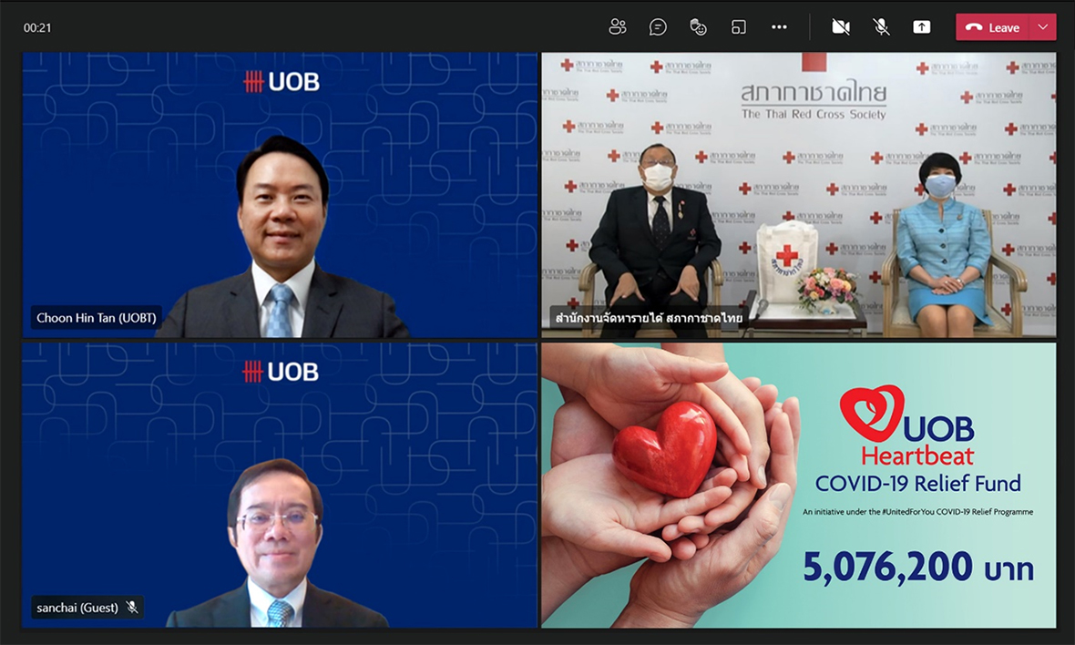 Mr Tan Choon Hin, President and CEO, UOB Thailand (top-left), Mr Sanchai Apisaksirikul, Country Head of Finance and Corporate Real Estate Services, UOB Thailand (bottom-left), thank The Thai Red Cross Society for their commitment in distributing relief kits for disadvantaged people during the virtual presentation of UOB Heartbeat COVID-19 Relief Fund donation to Thai Red Cross Society. The beneficiaries’ representatives include Mr Khan Prachuabmoh, Director of Fund Raising Bureau and Mrs Janprapa Vichitcholchai, Deputy Director of Fund Raising Bureau, The Thai Red Cross Society (top-right).