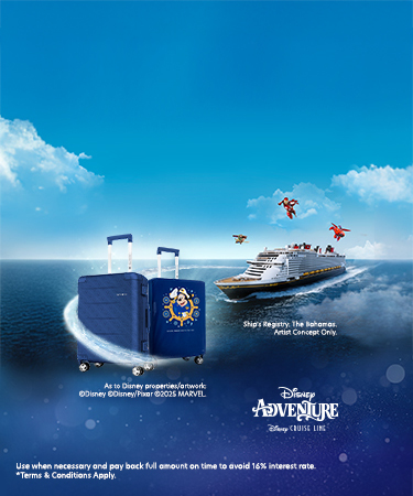 Be part of the Adventure with UOB. Spend and get a limited edition Disney Cruise Line Samsonite luggage set.