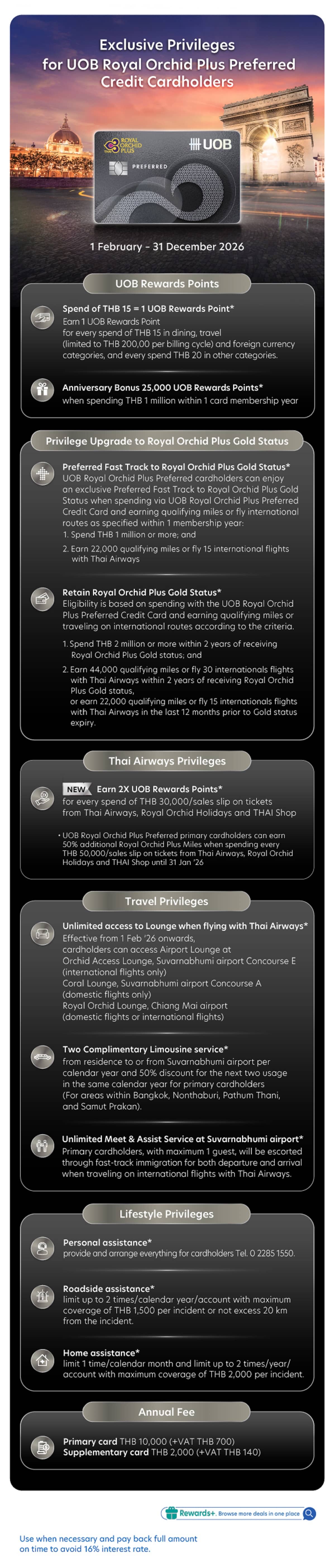 • Get 25,000 Anniversary UOB Rewards Points when spending THB 1 million within 1 card membership year, renewing card membership, and paying annual fee in the subsequent year.