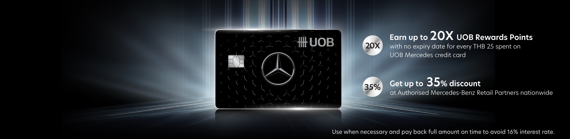 You can Earn 20X UOB Rewards Points for every THB 25 spent on new car deposit online payment at Authorised Mercedes-Benz Retail Partners nationwide (Limit up to THB 100,000/account/calendar year)
