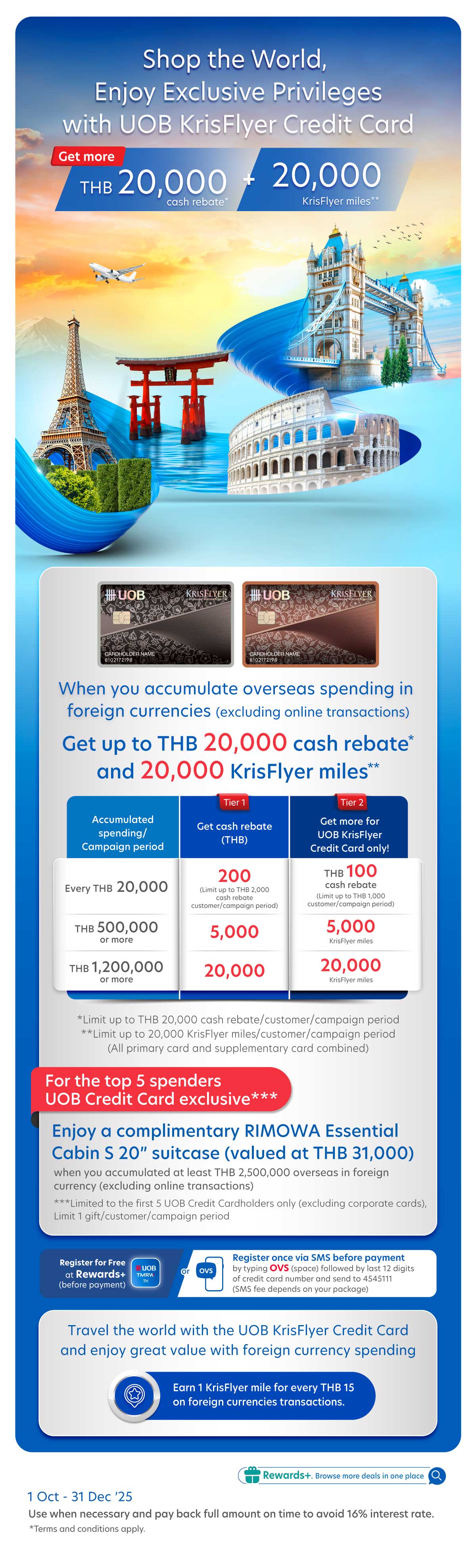 • Get THB 100 cash rebate when having accumulated spending in foreign currencies (as calculated in THB) for every THB 20,000 spent (limit up to THB 1,000 cash rebate / customer /campaign period, In case the total amount of accumulated spending throughout the campaign period does not exceed THB 499,999), or get 5,000 KrisFlyer miles when having accumulated spending in foreign currencies (as calculated in THB) from THB 500,000 or more/campaign period or get 20,000 KrisFlyer miles when having accumulated spending in foreign currencies (as calculated in THB) from THB 1,200,000 or more/campaign period