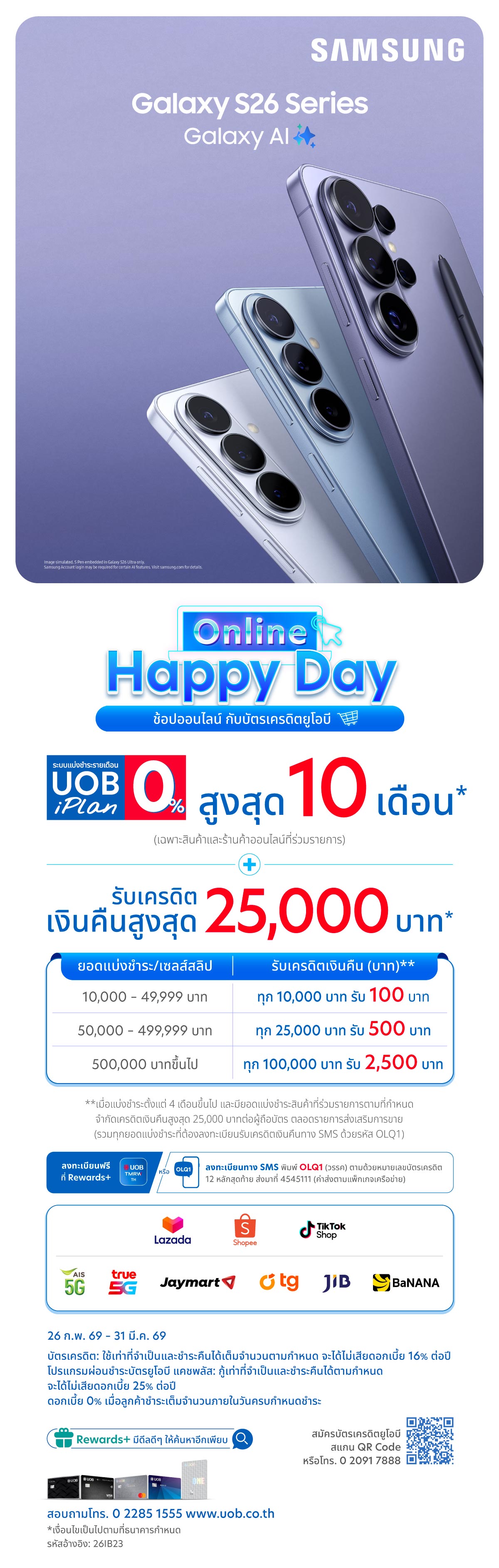 - รายการส่งเสริมการขายนี้ ระหว่างวันที่ 26 ก.พ. 69 – 31 มี.ค. 69 เฉพาะบัตรเครดิตยูโอบี หรือบัตรเครดิต TMRW ที่ออกในประเทศไทยเท่านั้น (ยกเว้นบัตรเครดิตเพื่อธุรกิจ) โดยผู้ถือบัตรจะต้องคงสถานะการเป็นสมาชิกบัตรและไม่ผิดนัดชำระหนี้จนถึงวันที่ธนาคารบันทึกยอดเครดิตเงินคืนเข้าบัญชีบัตรเครดิต