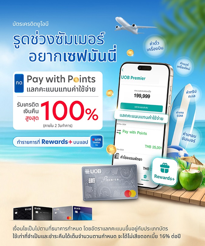 - ข้อกำหนดและเงื่อนไขเพิ่มเติมเกี่ยวกับคะแนนสะสมยูโอบี รีวอร์ด ปรากฏบนเว็บไซต์ https://www.uob.co.th/rewards/term-condition.html
