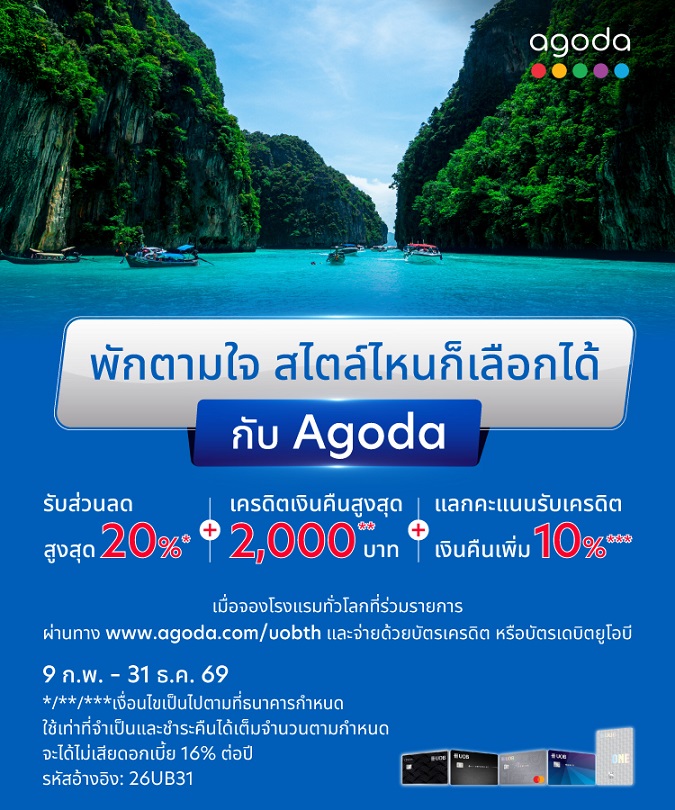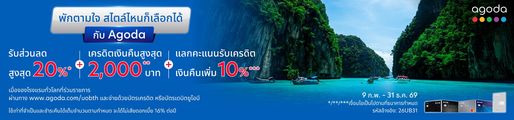 เมื่อมียอดใช้จ่ายผ่าน Agoda โดยจ่ายเป็นสกุลเงินบาทด้วยบัตรเครดิตยูโอบี