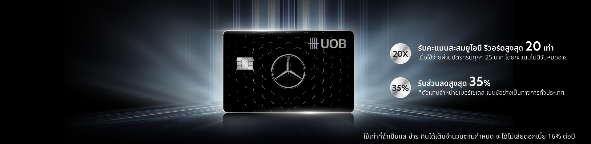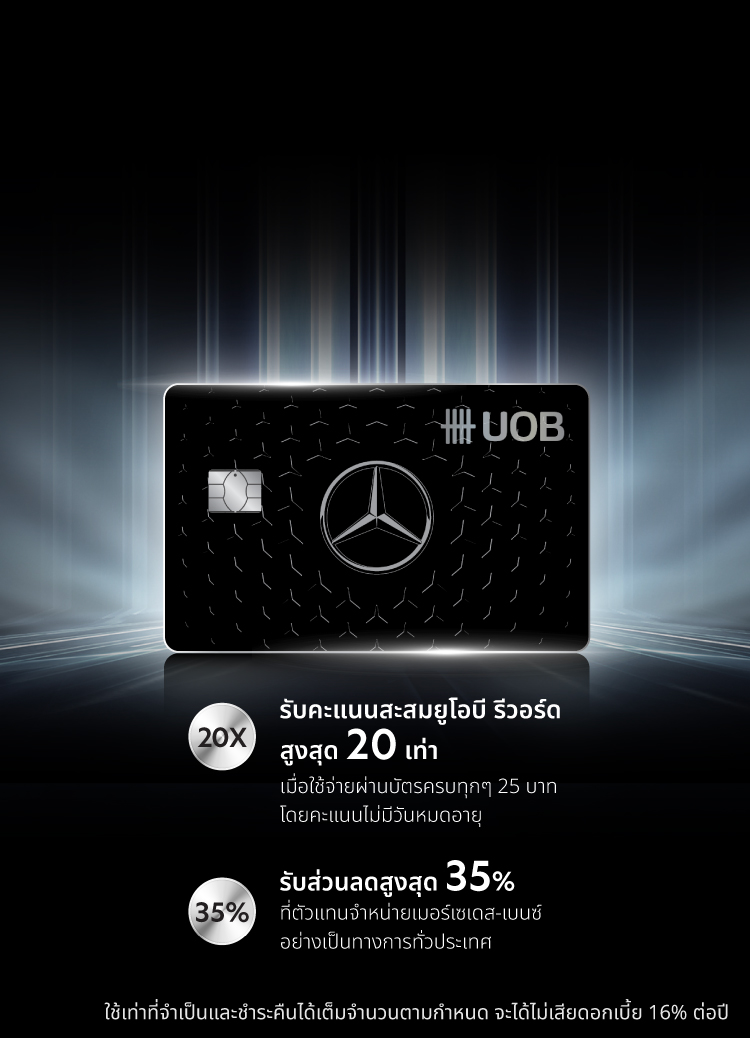 บัตรเครดิตยูโอบี เมอร์เซเดส - ไลฟ์สไตล์เหนือระดับด้วยสิทธิพิเศษเฉพาะคุณ เติมเต็มความสมบูรณ์แบบของยนตรกรรมให้กับรถยนต์เมอร์เซเดส-เบนซ์คู่ใจของคุณ ด้วยสิทธิพิเศษที่ผู้จำหน่ายเมอร์เซเดส-เบนซ์อย่างเป็นทางการทั่วประเทศ ให้ทุกประสบการณ์การใช้จ่ายเป็นที่น่าจดจำ พร้อมยกระดับการเดินทางของคุณด้วยบริการห้องพักรับรองพิเศษ ณ สนามบิน และบริการรถลิมูซีน สัมผัสความหรูหราไร้ขีดจำกัด และเพิ่มความสะดวกสบายในทุกเส้นทางขับขี่ของคุณ สมัครบัตรเครดิตยูโอบี เมอร์เซเดส วันนี้!