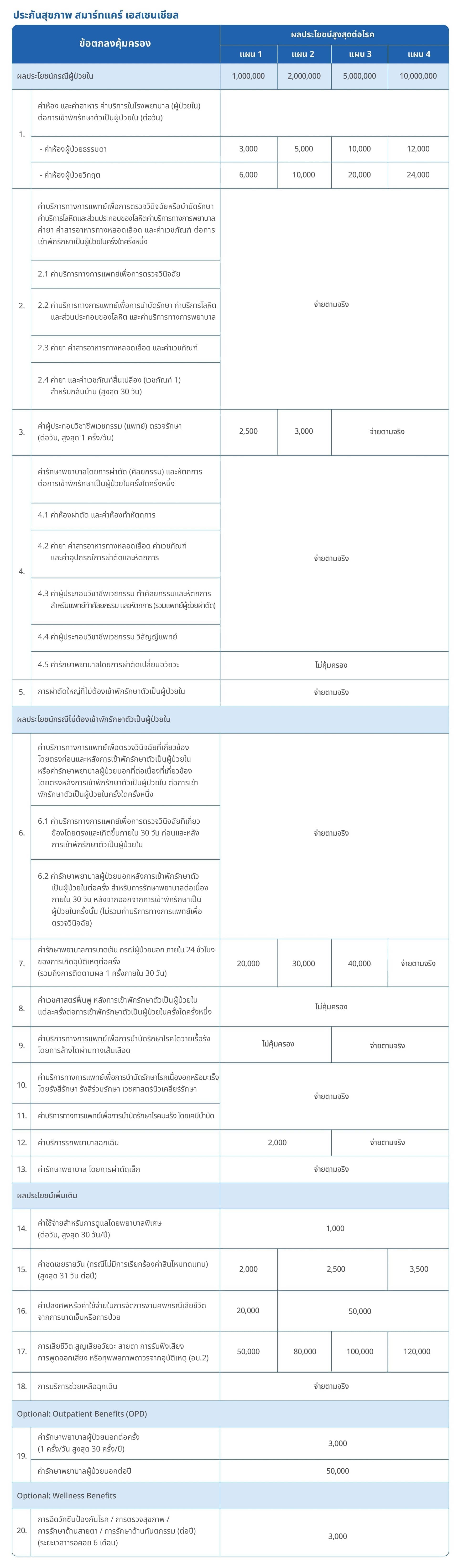 เงื่อนไข ความคุ้มครอง และข้อยกเว้นเป็นไปตามที่ระบุไว้ในกรมธรรม์ประกันภัย จำนวนความคุ้มครองและผลประโยชน์ขึ้นอยู่กับแผนประกันภัยที่เลือก เมื่อได้รับกรมธรรม์แล้ว โปรดศึกษารายละเอียด ข้อกำหนด และเงื่อนไขในกรมธรรม์