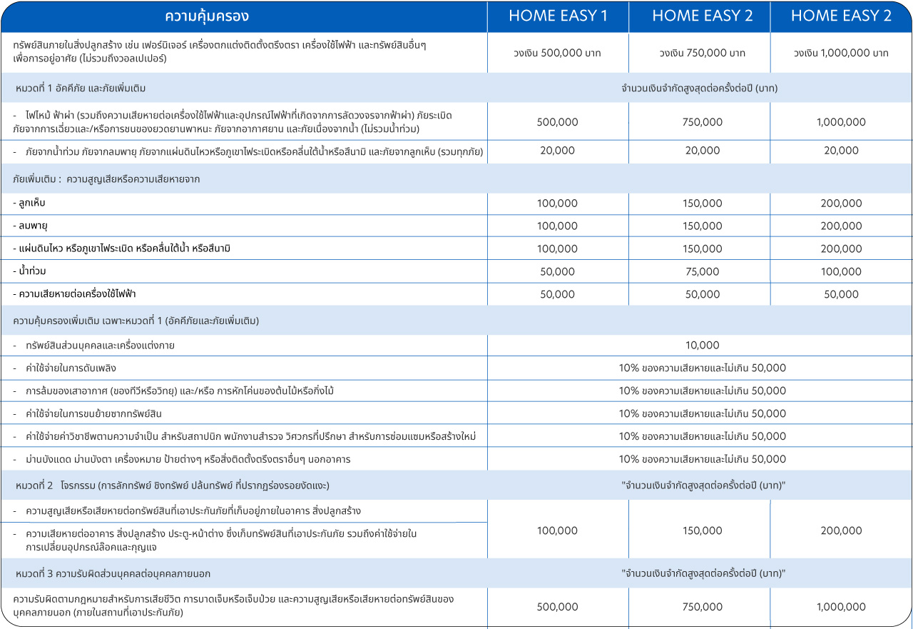 แบบประกันภัยทรัพย์สินภายในสิ่งปลูกสร้าง MSIG Home Easy เหมาะกับลูกค้าที่ยังไม่มีความคุ้มครองทรัพย์สินภายในสิ่งปลูกสร้าง หรือมีประกันภัยเฉพาะตัวอาคารสิ่งปลูกสร้าง ซึ่งโดยส่วนใหญ่ธนาคารจะให้ทำประกันภัยเฉพาะตัวอาคารในกรณีที่กู้เงินซื้อบ้าน แผนประกันภัย MSIG Home Easy จะให้ความคุ้มครองทรัพย์สินภายในสิ่งปลูกสร้าง ครอบคลุมทั้งไฟไหม้ ฟ้าผ่า ภัยระเบิด ภัยจากการเฉี่ยว และ/หรือ การชนของยวดยานพาหนะ ภัยจากอากาศยาน ภัยเนื่องจากน้ำ ภัยต่อเครื่องใช้ไฟฟ้า ภัยธรรมชาติ (ภัยน้ำท่วม, ภัยลมพายุ, ภัยแผ่นดินไหว และภัยลูกเห็บ) รวมถึงภัยโจรกรรม (ลักทรัพย์ ที่ปรากฏร่องรอยงัดแงะ ชิงทรัพย์ ปล้นทรัพย์) และความรับผิดต่อบุคคลภายนอก