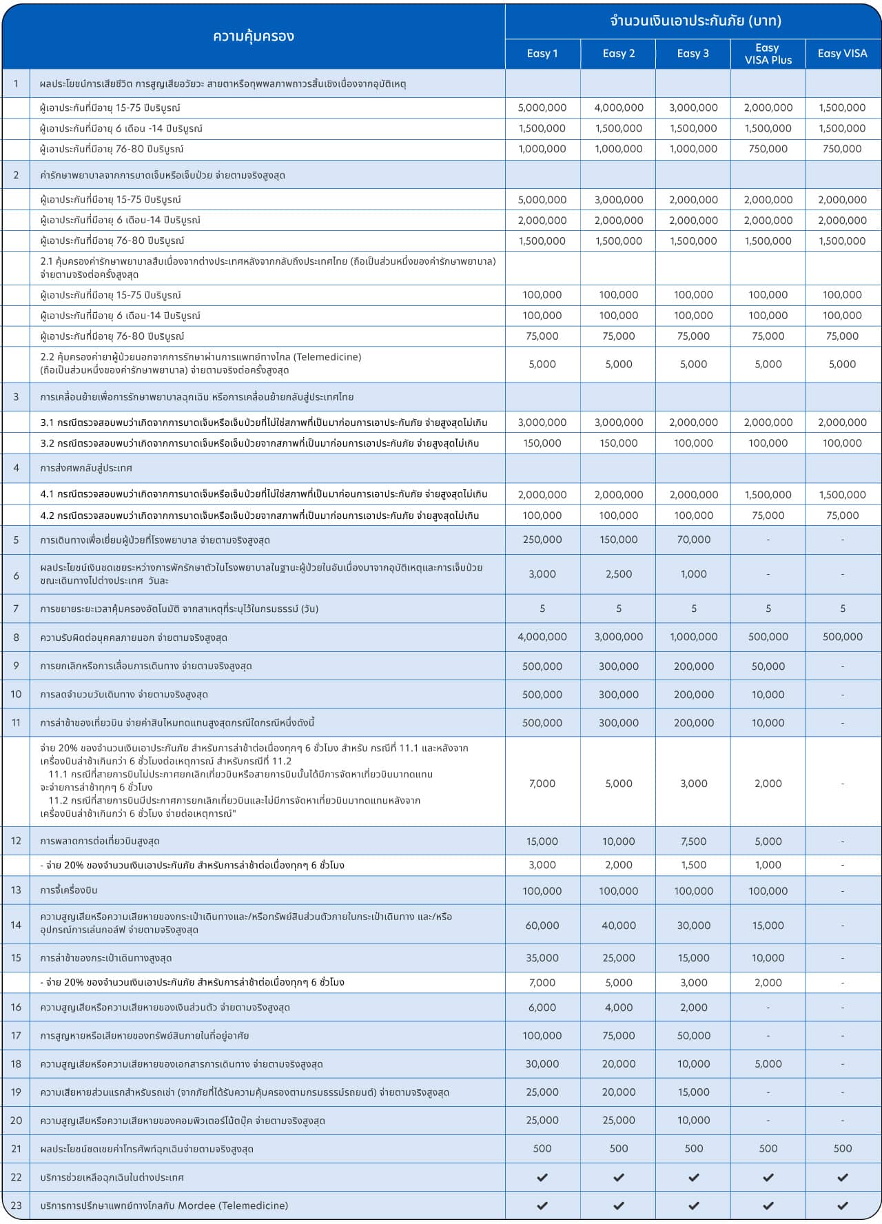 เงื่อนไข ความคุ้มครอง และข้อยกเว้นเป็นไปตามที่ระบุไว้ในกรมธรรม์ประกันภัย จำนวนความคุ้มครองและผลประโยชน์ขึ้นอยู่กับแผนประกันภัย