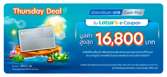 รายละเอียดรับ Lotus’s e-Coupon มูลค่ารวมสูงสุด 16,800 บาท เพียงทำรายการเบิกถอนเงินสดผ่านบัตรยูโอบี แคชพลัส ในทุกวันพฤหัสบดี