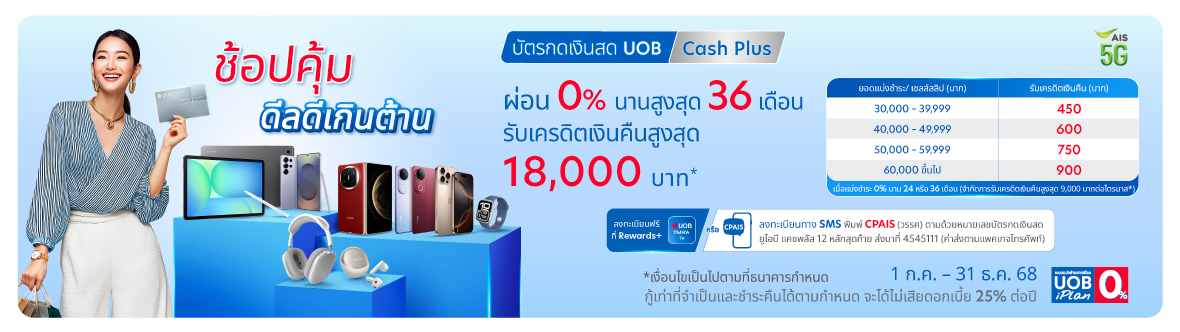 - รายการส่งเสริมการขายนี้ระหว่างวันที่ 1 กรกฎาคม 2568 – 31 ธันวาคม 2568 เฉพาะผู้ถือบัตรยูโอบี แคชพลัส (UOB Cash Plus) ที่ออกในประเทศไทย เมื่อชำระค่าสินค้า/บริการ แบบแบ่งชำระผ่านโปรแกรม UOB I-Plan ณ เอไอเอสช็อป เอไอเอส เทเลวิซช็อป และตัวแทนจำหน่ายสินค้าจากเอไอเอสที่ร่วมรายการ โดยผู้ถือบัตรต้องคงสถานะการเป็นสมาชิกบัตรและไม่ผิดนัดชำระหนี้จนถึงวันที่ธนาคารทำการเครดิตเงินคืนเข้าบัญชีบัตรยูโอบี แคชพลัส