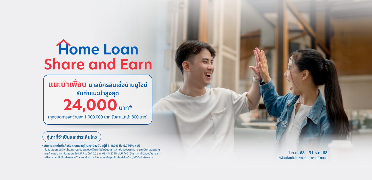ธนาคารขอสงวนสิทธิในการจ่ายค่าแนะนำให้กับผู้แนะนำที่ปฏิบัติตามข้อกำหนดและเงื่อนไขที่ธนาคารกำหนดอย่างถูกต้องและครบถ้วนเท่านั้น โดยผู้แนะนำจะต้องได้รับความยินยอมจากผู้ถูกแนะนำก่อนการเปิดเผยข้อมูลของผู้ถูกแนะนำให้กับธนาคาร เพื่อวัตถุประสงค์ตามโปรแกรม UOB Home Loan Share and Earn