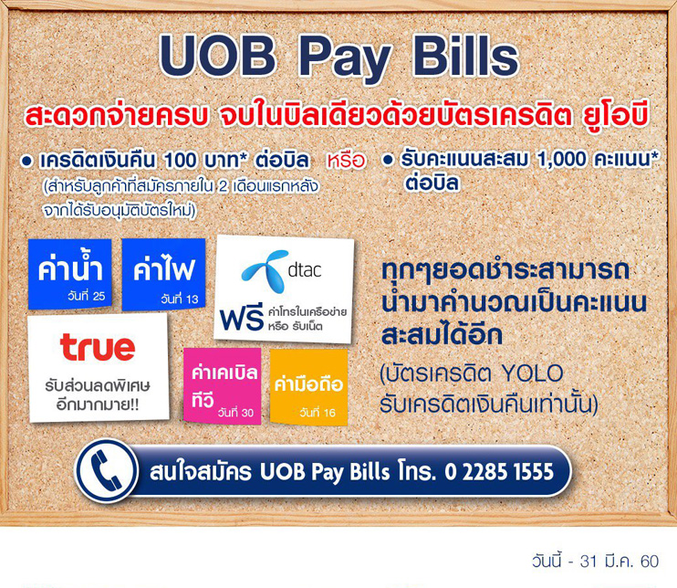 - UOB Pay Bills คือ การบริการหักบัญชีบัตรเครดิตเพื่อชำระค่าสาธารณูปโภค โดยการอนุมัติดำเนินการหักบัญชีบัตรเครดิต ผู้ให้บริการสาธารณูปโภคจะใช้เวลาดำเนินการประมาณ 1- 2 เดือน ซึ่งขึ้นอยู่กับการดำเนินงานของผู้ให้บริการแต่ละราย โดยระหว่างนี้ผู้ถือบัตรเครดิตมีหน้าที่จะต้องชำระค่าบริการนั้นๆให้แก่ผู้ให้บริการโดยตรง