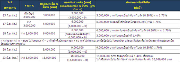 - ลูกค้าจะได้รับดอกเบี้ยโบนัส ในกรณีที่มียอดเงินฝากส่วนเพิ่มในแต่ละวันเทียบกับฐานเงินฝากคงเหลือ ณ สิ้นวันที่ 1 มิถุนายน 2559 ตั้งแต่ 3 ล้านบาท – 10 ล้านบาท