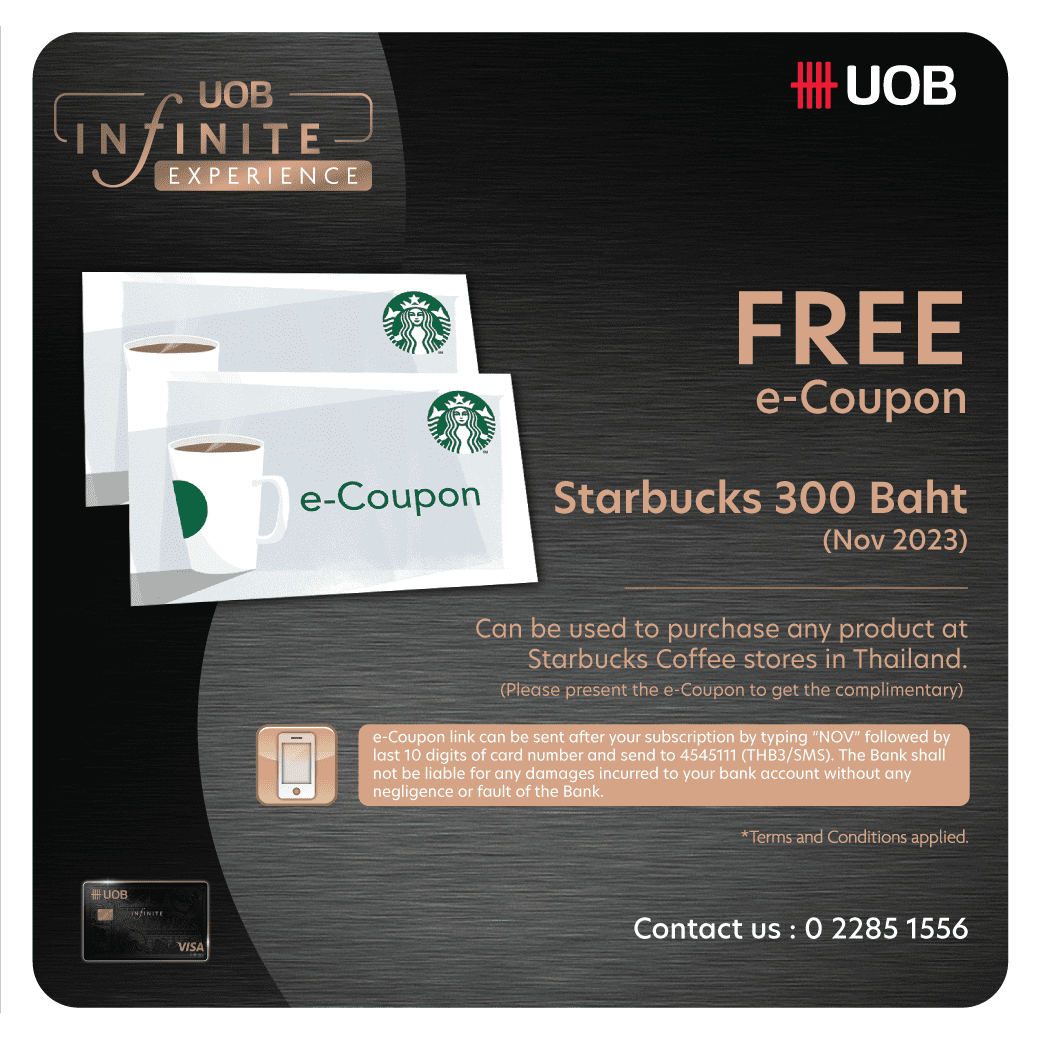e-Coupon link can be sent to the mobile phone number that registered with the bank, after your subscription by typing “NOV” (space) followed by last 10 digits of your primary card number and send to 4545111 (THB3/SMS). The Bank shall not be liable for any damages incurred to your bank account without any negligence or fault of the Bank.